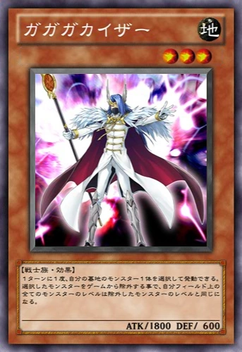 | 이 카드는 자신 필드 위에 이 카드 이외의 "가가가"라는 이름이 붙은 몬스터가 존재할 때만 공격할 수 있다. 또한, 1턴에 1번, 자신의 묘지의 몬스터 1장을 게임에서 제외하고 발동할 수 있다. 자신 필드 위의 모든 "가가가"라는 이름이 붙은 몬스터의 레벨은, 이 효과를 발동하기 위해 게임에서 제외한 몬스터와 같은 레벨이 된다. 이 카드는 싱크로 소재로 할 수 없다. | ||||