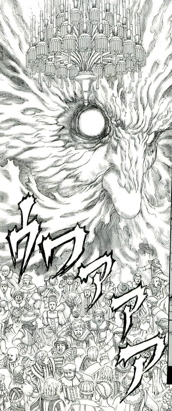 사도로서의 본능 때문에 대제는 그리피스와 마주한 것만으로도 큰 혼란을 느끼고, 그리피스가 손을 뻗어오자 위기감을 느끼고 사도로서의 모습을 드러내 마왕으로서의 위엄을 과시한다. 그 후 죽이진 않겠지만 포로로 만들어 친히 더럽혀주겠다고 하며 전격을 가하려 하나, 새장 치고는 공기가 탁하다는 그리피스의 여유로운 한 마디 이후 그룬벨드 등의 거대 사도들이 이동 궁전의 지붕을 떼내버린다. 그리고 그리피스가 일으킨 것으로 보이는 강풍에 버티지 못하고 형체를 유지 못한 채 흩어져버릴 위기에 처하자 다급히 인간의 모습으로 돌아와 그리피스 앞에 무릎을 꿇게 되고 만다.