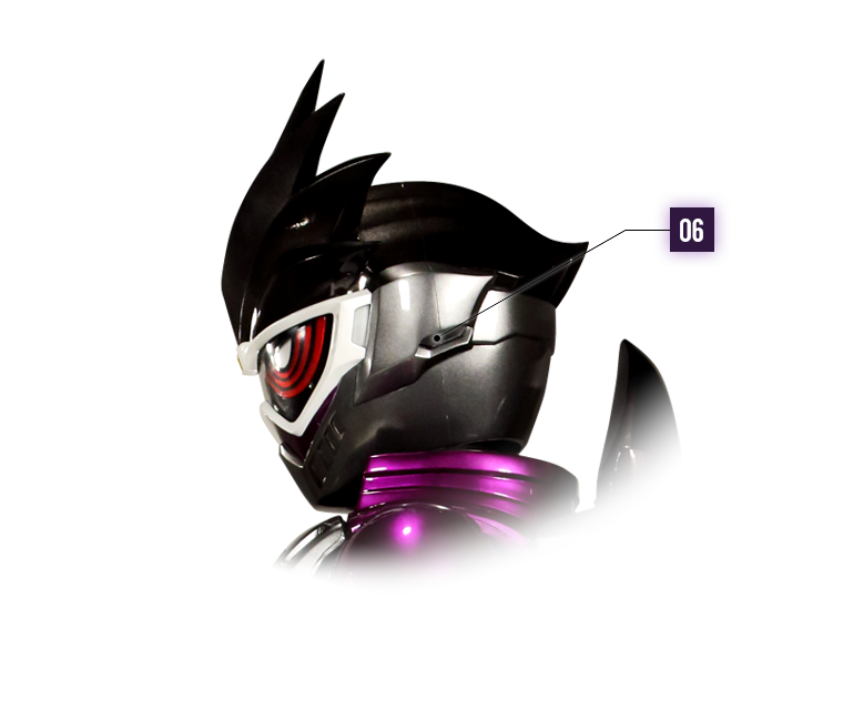 - 06. 센서 이어: 가면라이더 겐무의 시각 센서. 주위의 잡음을 차단하여 필요한 소리만을 변신자에게 들려주는 기능을 장비하고 있다. 특정 상대와의 음성대화를 행하기 위해 비밀 통신기능도 갖추어져 있다.