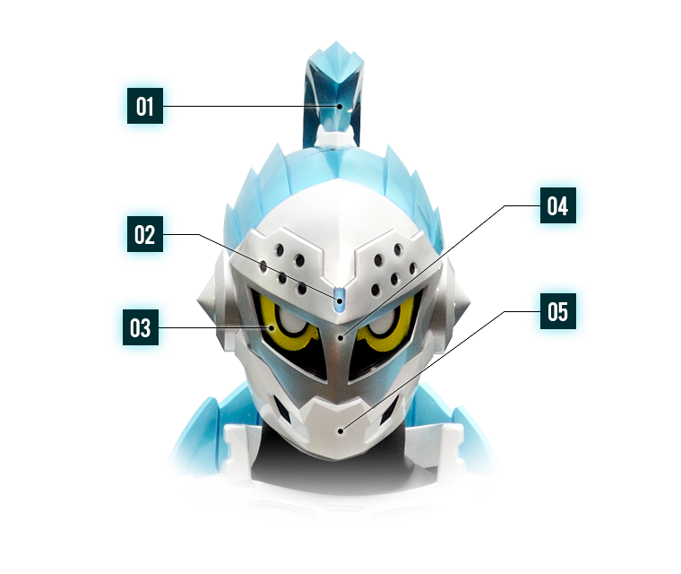 - 01. 가드 라이트 헬름: 가면라이더 브레이브의 두부를 보호하는 파츠. 내폭 코팅제가 표면에 도포되어 있으며, 보통 전투에 견딜 수 있는 충분한 강도를 갖추고 있다. 판타지 RPG 게임인 「태들 퀘스트」의 플레이어 캐릭터를 이미지한 형태로 되어 있다.