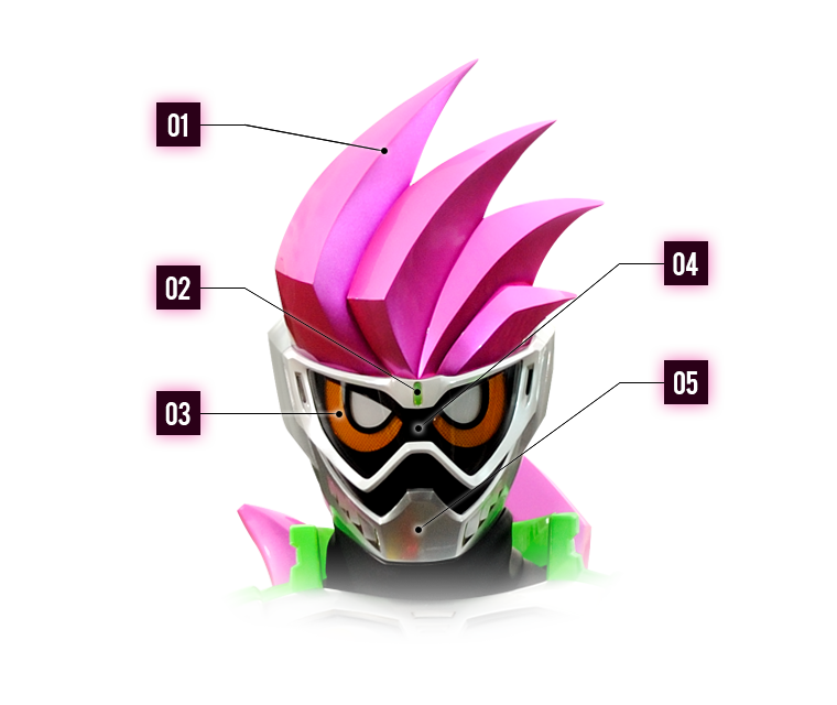 - 04. 다이나믹 고글: 가면라이더 에그제이드의 페이스 고글. 충격이나 더러워진 시각 센서를 보호하는 기능을 갖고 있다. 표면에 칠해진 내폭 코팅제에 의해 필요 이상의 강화된 강도를 통하여 절대로 부러질 일이 없다.