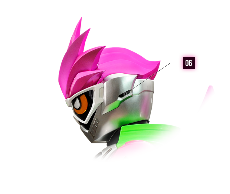 - 06. 센서 이어: 가면라이더 에그제이드의 시각 센서. 주위의 잡음을 차단하여 필요한 소리만을 변신자에게 들려주는 기능을 장비하고 있다. 특정 상대와의 음성대화를 행하기 위해 비밀 통신기능도 갖추어져 있다.