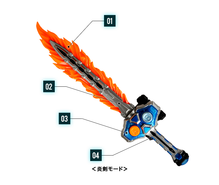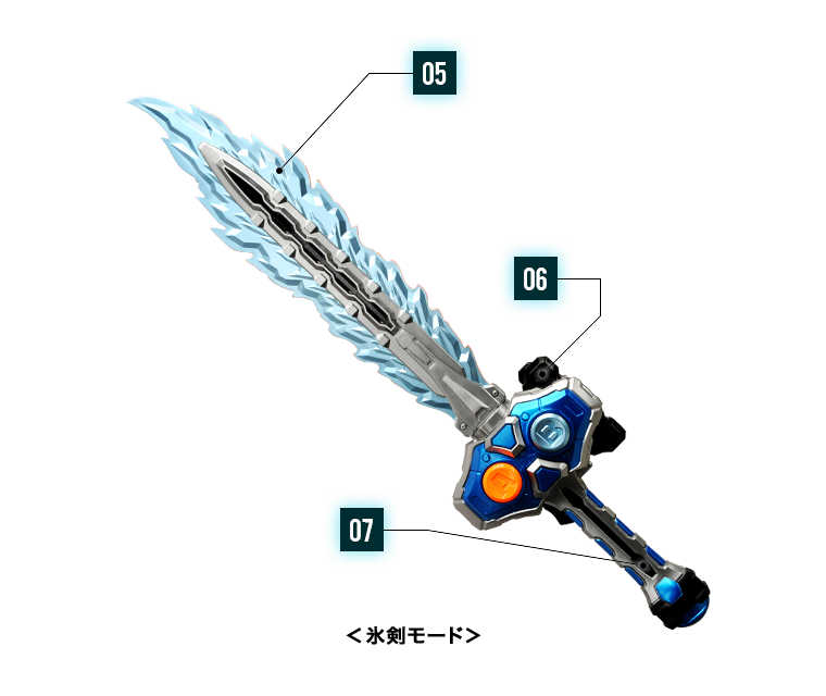 - 02. 모드 트랜서: 가샤콘 소드의 모드 변경 장치. 어택 러시 패드를 버튼 입력에 따라 불꽃검 모드와 얼음검 모드를 전환할 수 있다.
