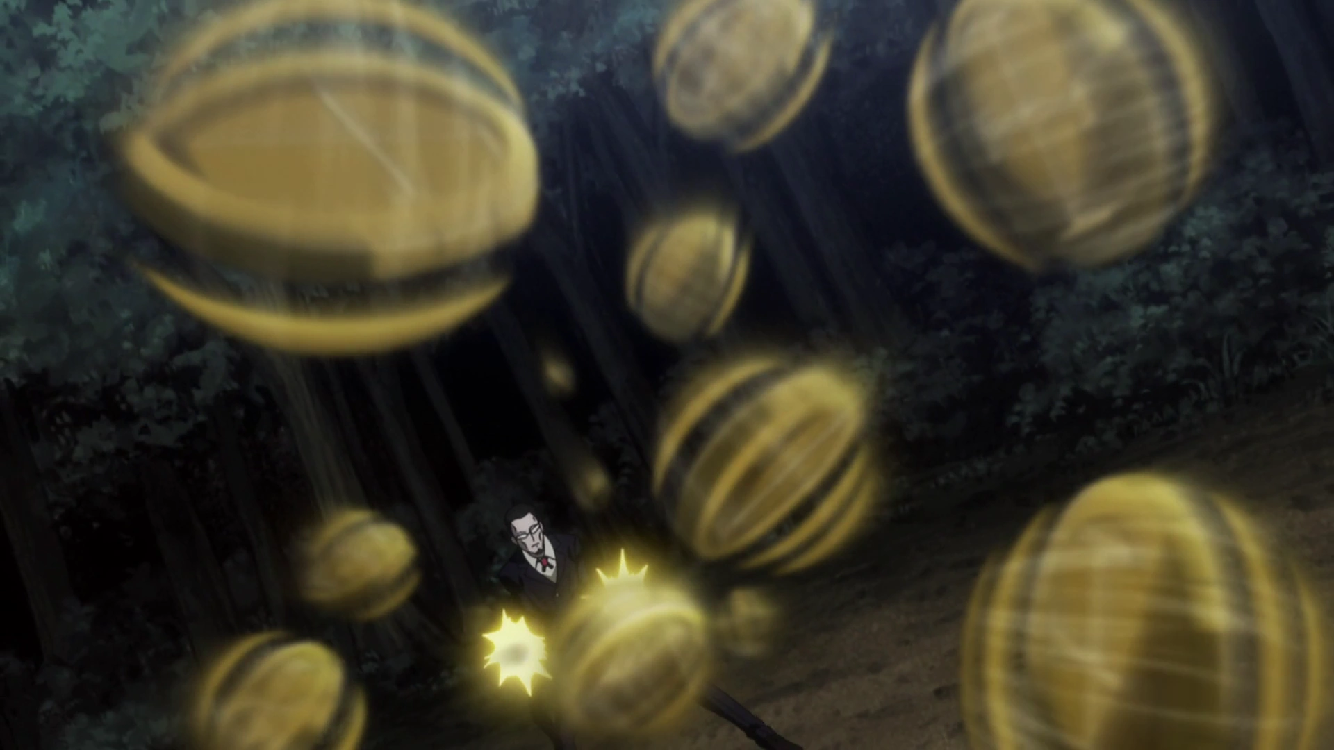 - ↑ 그렇다고 딱히 위력이 약한 것은 아니다. 넨 능력자인 히소카를 벌집으로 만들 수 있다고 자신하고 있었으며, 사람 몸통보다 몇배는 굵은 나무를 한순간에 벌집으로 만들어 쓰러뜨리는 모습을 보면 적어도 기관총보다는 강한듯.