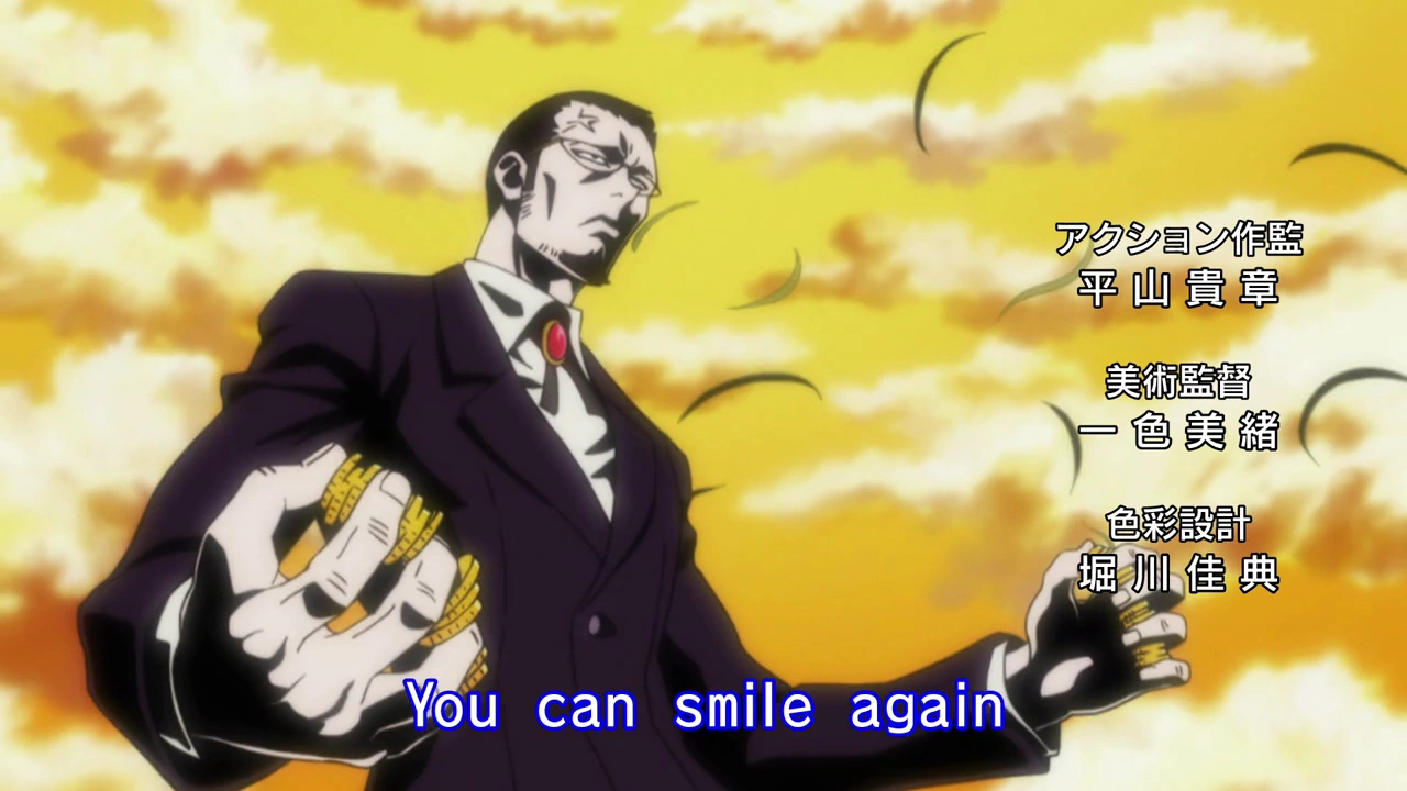 막판에는 세 명이서 동전을 현란하게 뒤섞지만 곤의 시력에 완패. 나중에는 시간 때우기를 위한 연극이었다며 곤 일행에게 웃는 얼굴로 박수를 쳐 주고, 그들을 배웅한다. 그들이 출발하기 전, 곤을 따로 불러내 이제까지와는 달리 속임수가 들어간 동전 맞추기를 보여주더니 곤에게 "보는 것만이 진실은 아닙니다."라는 식의 말을 해주며 키르아를 잘 부탁한다고 했다.[3] 이것이 진심인 듯. 하지만 키르아가 오고 있다는 소식을 듣고 장난으로 급하게 바꾼 가능성이 낮지는 않기 때문에 꽤나 위험해 보이는 캐릭터.