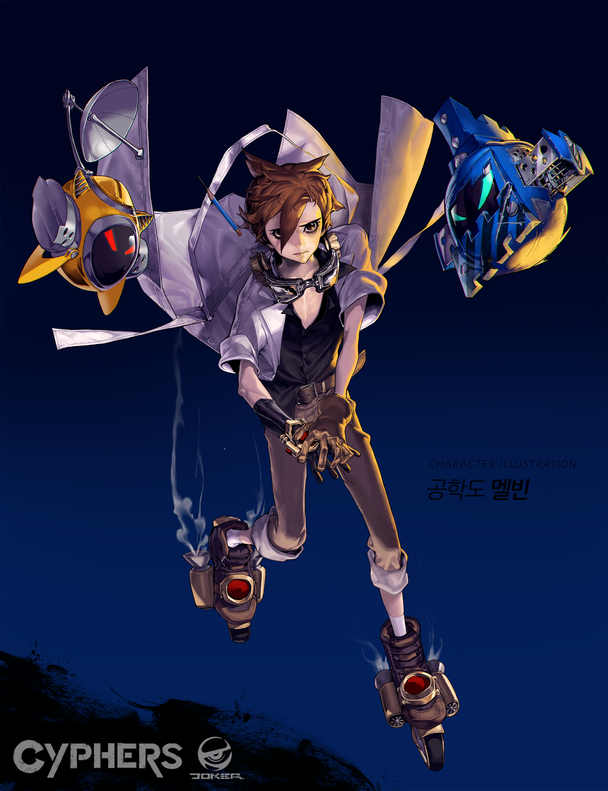 사이퍼즈 페스티벌에서 공개된 본인 영상에선 설치형 스킬과 화려한 연출의 미사일 폭격을 보여주었다. 개발진의 언급으로는 포지션이 원거리 딜러이며, 난이도는 쉽다고 한다. 그리고 던파의 멜빈 리히터보다 비교적 나이가 어려 '보이는' 캐릭터로 등장했다. 전자가 귀차니즘으로 가득한 천재 청년이었다면, 사이퍼즈에 등장한 멜빈은 보다 소년 같은 외모를 하고 있다. 페스티벌에서도 사회자가 '옆동네 멜빈의 과거 모습인가요?' 라고 물어봤으나 개발진은 이를 부정하고 '콜라보레이션' 개념이라 설명했다.[11] 이 질문은 사회자가 사이퍼즈에 대한 이해가 높았으면 나오기 어려웠을 질문인데, 던파와 사이퍼즈의 세계관은 직접적인 연관이 없기 때문이다. 즉, 멜빈 역시 기적의 미쉘이나 닥터 까미유, 드루이드 미아, 거너 J등의 사례처럼 던파의 캐릭터 이름과 컨셉을 빌려왔을 뿐, 사이퍼즈에서는 완전히 별개의 인물이라 보는 게 옳다.