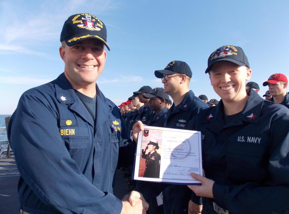 CPO들의 드레스 블루는 장교용과 같으나, 계급장이 수장이 아닌 왼팔에 붙고 근속장(아래 소매의 사선 막대로, 4년 근속시마다 1줄씩 늘어난다.)이 박히며[9], 정모 턱끈이 검정이고 모표가 계급장 역할을 하므로 계급별로 모표가 달라진다는 점이 다르다.