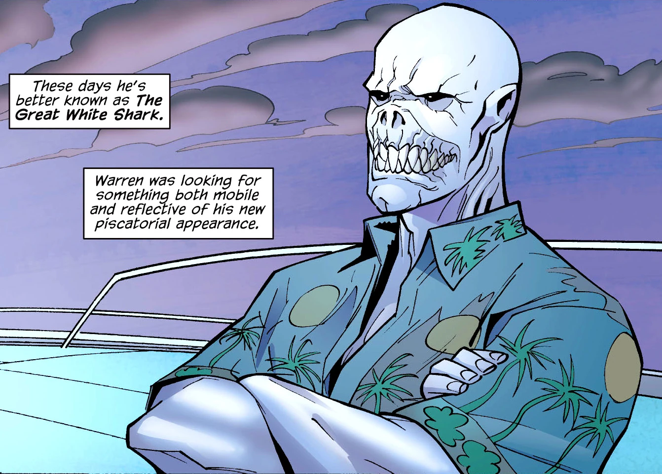 본명은 워런 화이트(Warren White). 첫 등장 및 그레이트 화이트 샤크로 거듭나게 되는 이슈는 아캄 어사일럼: 생지옥(Arkham Asylum : Living Hell). 작중 주인공이다. 참고로 이 작품의 스토리 작가가 피터 파커를 죽인 자로 악명 높은(?) 댄 슬롯이다.