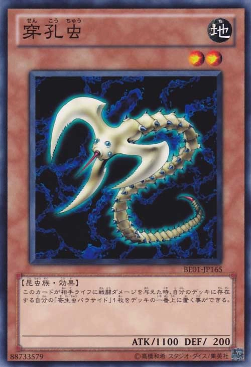 기생충이라는 이름처럼 상대 덱에 숨어들어갔다가 튀어나오면서 데미지를 주고 상대 필드의 몬스터를 곤충족으로 만드는 카드. 상당히 독특한 효과를 가졌지만 그 효과를 쓰기 위해서는 난관이 엄청나게 많은 카드다. 일단 가장 큰 첫번째 난관은 카드 자신이 효과의 대상인지라 효과 처리 중에 필드위에 존재해야 한다는 것. 리버스 몬스터의 효과는 전투가 끝난 후에 처리 되고 공격력 300 이하의 카드로 전투를 하는 경우는 없기 때문에 전투로 인해 리버스 됐을 경우에는 효과 불발은 예약이다.[2] 결국 방어 카드들로 한 턴 버틴 다음 리버스 시키던가 태양의 서같은 것으로 세트하자마자 리버스하던가 하는 식으로 추가 지원이 필요하다.