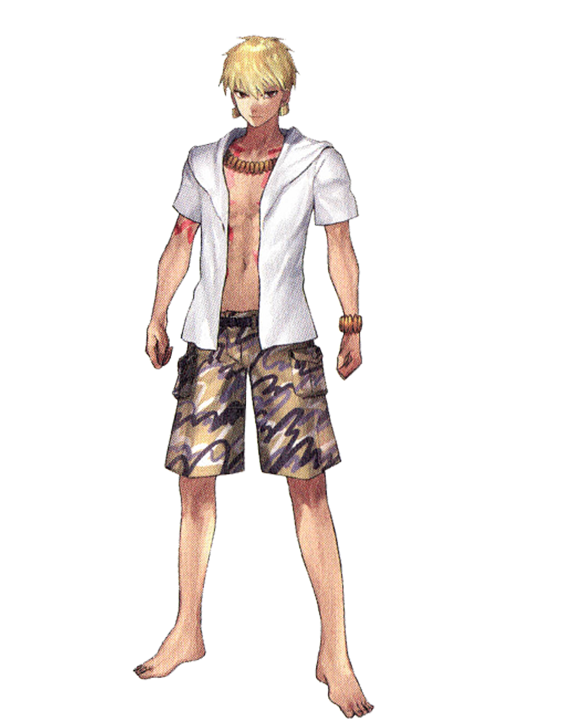 불타는 불꽃처럼 곤두선 금발과 단정하다고 하기에는 너무 화려한 아름다움을 가진 요염한 미모의 청년. 하지만 그놈의 초사이어인 머리가 모든 것을 잡아먹지 그러니까 앞머리 내리자 눈동자 색깔은 루비와 같은 진홍빛. 당당한 장신에 갈고 닦인 황금 갑옷을 입고 있다. 매체에 따라 생략되기도 하지만, 갑옷 허리 부분에는 친우인 엘키두와 마찬가지로 검은 끈이 달려있다. 주로 아처 클래스로 참전한다.