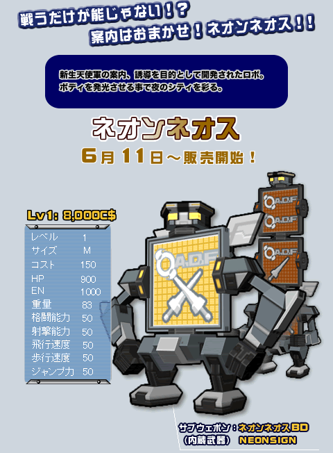 본격 움직이는 간판 로봇. 내장 서브 무기로 본체의 간판을 발광시킬 수 있으며, 위력은 1. 머신건 단발 사격만도 못하여 당연히 대미지는 마니모나이프만큼도 안 먹힌다. 즉 간판 칠하고 놀라는 의미로 만들어진 개그용 로봇...