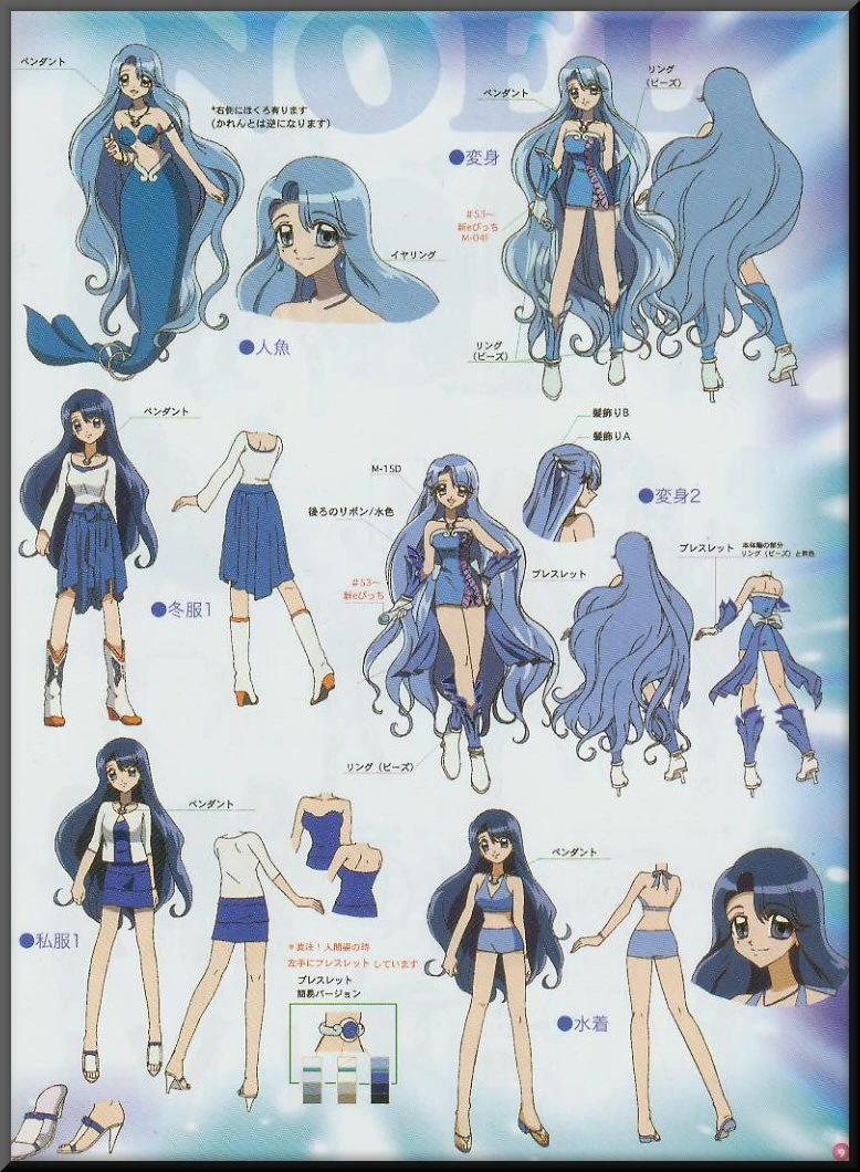 만화 2기 이후는 앞머리가 짧아지고 머리 모양이 변화하고 있다. 애니에서는 처음부터 2기 헤어스타일이다. 애니에서는 추리 소설을 좋아하고 예상하지 못한 일에 대한 수수께끼를 추리할 때 안경을 착용한다. 성격은 너그럽고 상냥하지만 화가 나면 무섭다. 보기에는 천연 같지만 의외로 츳코미 역인데 아무래도 동생인 카렌을 포함한 몇몇 프린세스들이 푼수끼[3]를 보여서 그런 듯하다. 물론 루치아, 하논, 리나의 연애가 잘 되게 하려고 행동할 때는 천연 같은 모습을 보이지만 말이다. 애니에서는 코코와 카렌과 다르게 의외로 개인 에피소드가 없는 것이 특징이다. 여담으로 애니에서 카렌이 노엘을 부르는 호칭은 1기와 2기가 다른데 1기에서는 언니라고 부르며 2기에서는 노엘이라고 부른다. 만화에서는 처음부터 노엘이라고 부른다. 안타깝게도 자신의 곡은 없다. 2기 마지막에서 유리와 힛포가 다시 만났을 때, 싱글 앞에서 염장 지르지 말라고 소리친다.