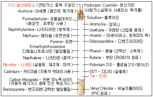 | 기타 미공개 물질 | 충격적인 사실은, 담배를 이루는 모든 물질이 다 공개된 것이 아니다. 화장품이나 기타 의약품처럼 인체에 직접적으로 영향을 미치는 다른 제품같은 경우 모든 구성 성분을 공개하도록 법에 규정되어있는 것에 비해, 대한민국에서는 담배의 구성 성분을 공개할 법적인 근거가 없다.[4] 물론 외국의 경우 구성성분을 다 공개하도록 되어 있다. 대한민국만 이상하게 법적인 근거가 없는것. 이에 안철수 의원이 해당 법안을 발의했다! 야당쪽인 안철수 의원이 발의한 법안이지만, 여당과 식약청 모두 긍정적으로 검토하고 있다고 한다.[5] | |