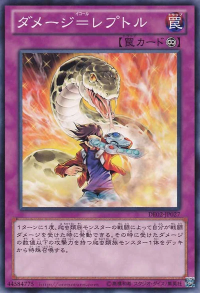 데미지 콘덴서와는 달리 지속 함정 카드라서 계속 우려먹을 수 있고, 패를 버릴 필요가 없다. 대신 파충류족 몬스터가 전투를 해서 데미지를 받아야 하기 때문에 상대가 파충류족 이외의 몬스터로 다이렉트 어택을 하게 되면 효과가 발동하지 않는다. DNA 개조 수술로 파충류족을 선언해 버리면 상대의 다이렉트 어택에도 효과를 발동 할 수 있을 것이다.