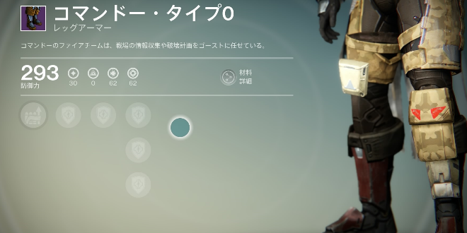 | Type 0에서 5까지 나뉘는데 특성은 순서대로 94/89/90, 92/93/92, 97/94/93, 93/90/93, 87/92/88, 93/89/88이다. | Type 0에서 3까지 나뉘는데 1과 2는 최대 방어력이 402, 3는 최대 방어력이 399까지 적용되며 각각의 특성은 0/+8/-1, 0/+8/0, 0-1/-3씩 보정된다. | 헬멧과 동일하다. 최대 방어력은 0과 2가 299까지 나머지가 302까지 올라가며 각각의 특성은 79/80/79, 76/77/79, 80/79/78, 78/77/78, 79/78/84, 80/80/83으로 적용된다. | Type 0에서 2까지 나뉘는데 Type 1이 113/110/113로 적용된다. |