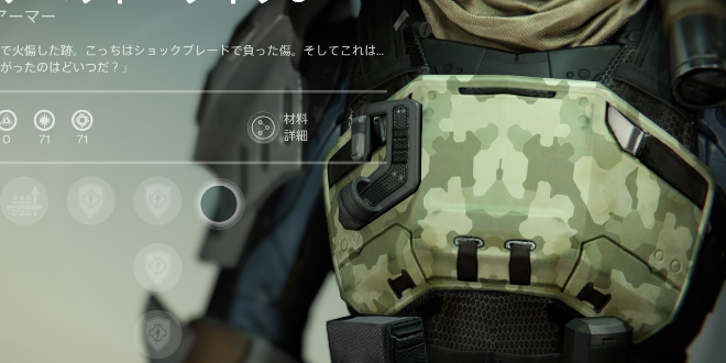 | 타이탄 헬멧은 HUD가 맛이 갔을 경우를 상정해 반투명으로 제조되었습니다. | 정찰병용 경장갑 갑옷은 견고하고 정비하기 쉽습니다. | 타이탄용 건틀렛은 전통적으로 두터운 갑옷으로부터 손가락을 자유롭게 움직일 수 있습니다. 따라서 무기 제어성은 탁월합니다. | 세라믹, 합금, 전시 물자로 이뤄진 층과 공수된 빛으로 타이탄의 장갑에 놀라운 기동력을 부여했습니다. |