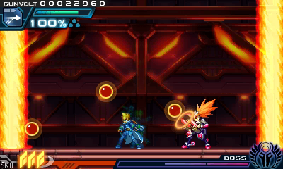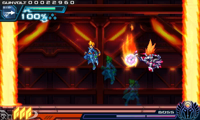 화염 기둥을 차면서 지그재그로 올라가고는 공중에서 작열탄을 3 → 2 순으로 흩뿌린다. 그러고는 플레이어가 있는 위치로 드롭 킥을 작렬시키는 패턴. 작열탄은 뇌격린 배리어로 방어, 드롭 킥은 두 번째 작열탄을 흩뿌린 후에 붙어있는 화염 기둥에서 시전하니 경우에 따라선 가만히 있는 게 되려 이득일 수 있다. 사실 그럴 필요도 없이 그냥 화염 기둥 근처에 바짝 붙는 게 가장 안전하지만(...).