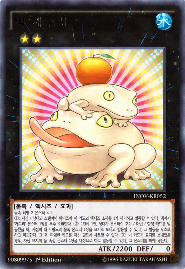 | 물족 레벨 2 몬스터 x 2 ①: 자신 / 상대의 스탠바이 페이즈에 이 카드의 엑시즈 소재를 1개 제거하고 발동할 수 있다. 덱에서 "개구리" 몬스터 1장을 특수 소환한다. ②: 1턴에 1번, 상대가 몬스터의 효과 / 마법 / 함정 카드를 발동했을 때, 자신 패 / 필드의 물족 몬스터 1장을 묘지로 보내고 발동할 수 있다. 그 발동을 무효로 하고 파괴한다. 그 후, 파괴한 카드를 자신 필드에 세트할 수 있다. ③: 이 카드가 묘지로 보내졌을 경우, 자신 묘지의 물 속성 몬스터 1장을 대상으로 하고 발동할 수 있다. 그 몬스터를 패에 넣는다. | ||||
