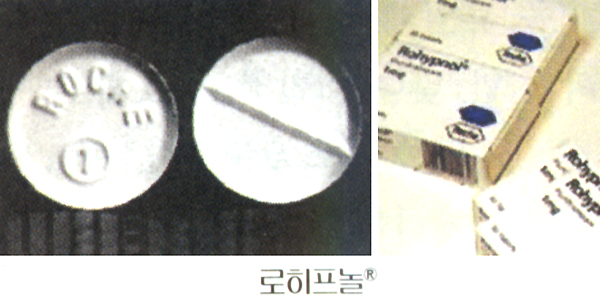 GHB와 함께 대표적인 데이트 강간 약물로서, 그 해악성 때문에 몇몇 로히프놀 제제의 경우 위 사진에서 볼 수 있는 것과 같이 알코올에 넣었을 경우 파란색을 나타내며, 서서히 용해되도록 특수처리를 하여 제조되고 있다고 하며, 잘 알지 못하는 타인이 건네준 음료의 색상이 이상하거나 할 경우 마시지 않는 것이 가장 좋다.