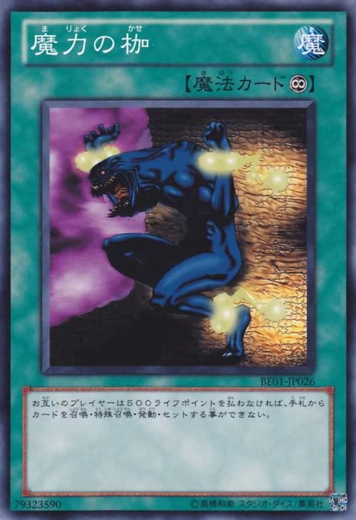 위의 마력의 족쇄를 공격 한정으로 바꾼 카드. 단, 자신은 지불하지 않아도 되게 되었다. 비슷한 카드로는 묘지기의 마법이 있다. 이쪽은 라이프 코스트가 아니라 덱 파괴.