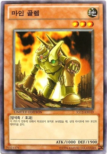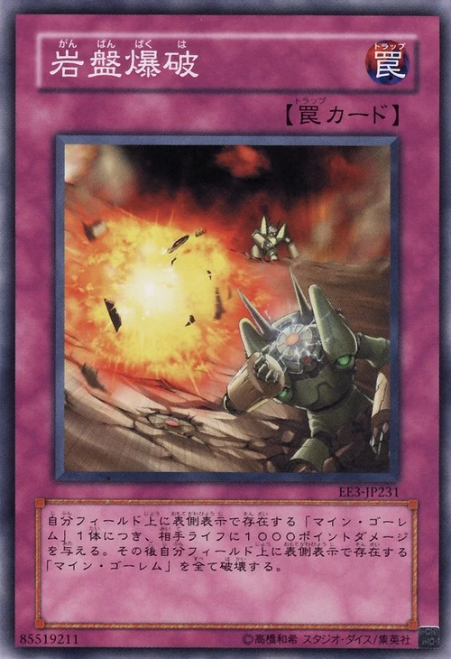 | 자신 필드 위에 앞면 표시로 존재하는 "마인 골렘" 1장당, 상대 라이프에 1000 포인트 데미지를 준다. 그 후, 자신 필드 위에 앞면 표시로 존재하는 "마인 골렘" 을 전부 파괴한다. | ||||