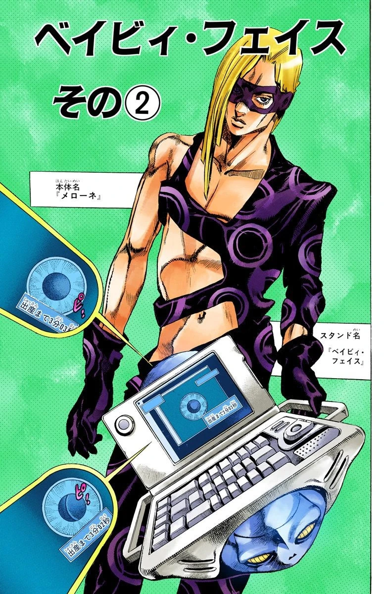 8. 디아볼로가 어느 정도 접근했을 때로 보인다. 실제로 좀 멀리 떨어져서 턴을 잠깐 보내보면 자고 있는 여성 캐릭터(또는 죠타로의 DISC 위에 올라간 쿠죠 죠린) 한명에 멜로네 여럿이 뱅글뱅글 돌고 있는 걸 볼 수 있다(...) 뭐하는 짓인가 싶다 (마찬가지 현상을 3부 DIO에게도 찾아볼 수 있다.) 다가가다 보면 싸다구 모션(...)과 함께 멜로네가 그 여성 캐릭터를 베이비 페이스로 바꾸는데, 이 경우처럼 멜로네가 여럿 붙어있었을 경우 방금 바뀐 베이비 페이스를 베이비 페이스로 바꾸는(...) 풍경도 볼 수 있다. 같은 턴에 여러 멜로네가 같이 효과를 발동했기 때문에 벌어지는 진기한(...) 구경거리. 우리는 여기서 베이비 페이스의 성별은 여성이라는 걸 알 수 있다.