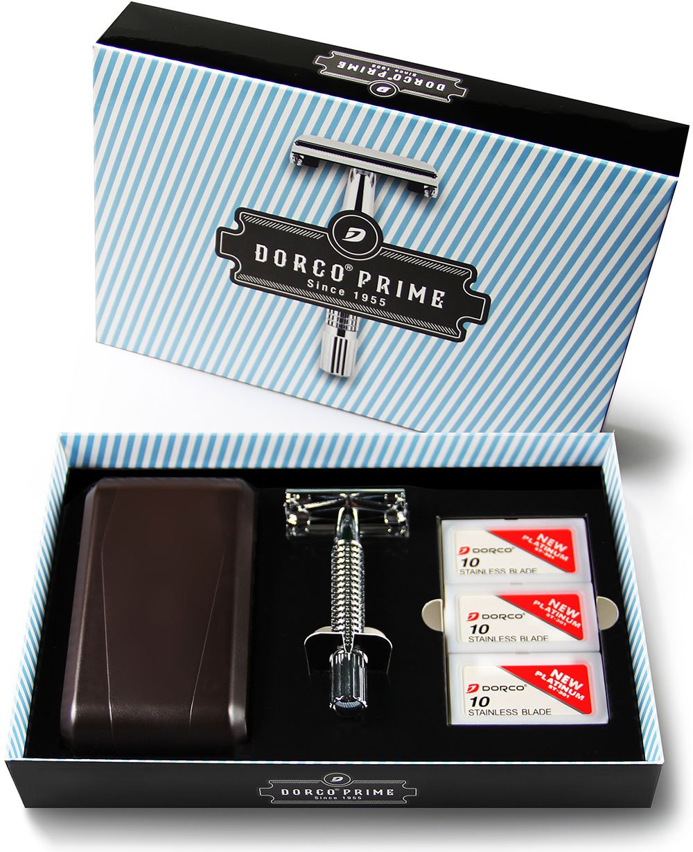 미국 아마존에서 파는 프라임 스타터키트. 버터플라이식 면도기 1개 + 여행용 케이스(거울 부착) + ST-301 면도날 30개로 구성.