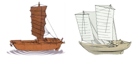 한선(왼쪽)과 중국 정크선인 신안 출토 무역선(오른쪽)의 비교.*