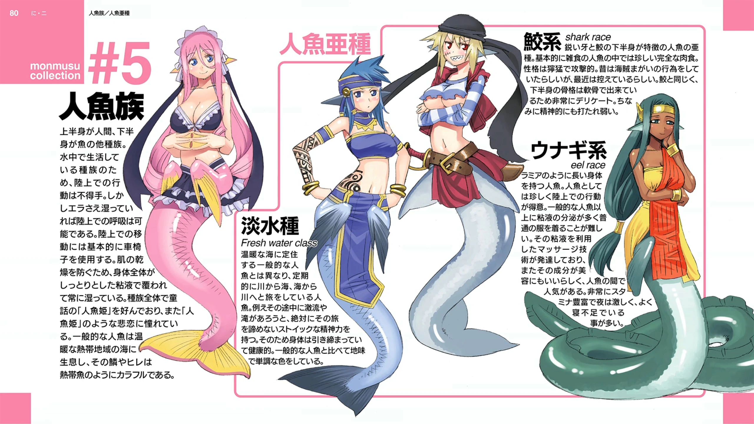 인어족은 상반신이 인간, 허리 부근부터 하반신이 물고기의 꼬리로 되어 있는 종족이다. 지상에서의 행동이 불편한 편이므로, 대다수가 이동시 휠체어를 사용한다. 옆구리에 아가미가 있는데, 이 아가미만 제대로 젖어 있다면 호흡이 가능하다는 모양. 또한 수중 상의 생활을 위해 온몸이 미끈한 점액으로 덮여 있다. 대부분의 개체가 인어공주에 지나지게 집착하여, 대체적으로 인어공주와 같은 사랑에 빠졌다고 한다.[15] 일반적인 인어는 온난한 열대지역의 바다에서 살기에 지느러미와 비늘이 화려한 편. 36화에서 엑스트라로 마나 남성의 존재가 확인되었는데, 외모는 나름 준수한 편에 속한다. 그런데 여성 인어들 간 인어공주식 비극이 크게 유행하다보니 인간 남성에게 여성을 뺏기는 경우(...)가 대다수라고 하는데, 여성 인어들은 이를 사랑의 도피(...)라 부르는 듯하다. 헌데 무려 인어들의 왕[16]이 인간과 사랑의 도피를(...) 한 적이 있다고 하며, 그렇기에 라미아, 하피, 켄타우로스 못지 않게 괴상한 종족이다.