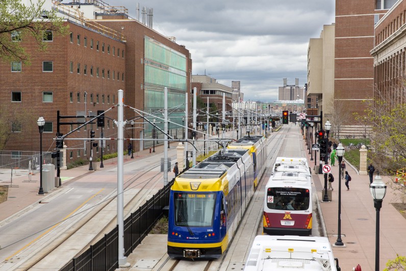 미니애폴리스와 세인트 폴을 잇는 경전철이 2014년 후반에 완공되었다. 과거 미국 전차 스캔들에 떠밀려 사라진 트램이 부활하는 셈인데 이 노선은 워싱턴 길을 따라 캠퍼스 서부와 동부를 가로질러 지나가도록 설계됨으로서 버스로 통학하는 세인트 폴 학생들에게는 매우 편리하다. (겨울을 생각하면..) 거기다가, 다운타운도 몇 정거장만에 갈 수 있다. 다운타운은 니콜렛 몰과 도서관 때문에 갈 일이 많다. 참고로 다운타운의 거의 모든 빌딩이 지상 터널로 연결되어있어서 하나의 거대한 몰이라 생각해도 좋다. 이유는 당연하지만 더럽게 추워서(...). 또, 세인트 폴에 있는 몰 오브 아메리카로 가기 위해서 예전엔 다운타운까지 버스타고 가서 경전철로 갈아타야하는데, 지금은 그냥 전철만 타면 된다. 참고로 몰 오브 어메리카에 실내 놀이공원도 있고 아쿠아리움도 있다. (...) 다 너무 추워서 실내에 있는 것이다. 놀이공원과 수족관 때문에 상점들이 그냥 장식품 같다는게 함정.(...)