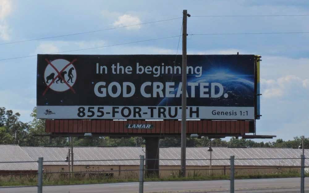 진화론을 부정하는 창조설 광고를 걸어놓은 모습