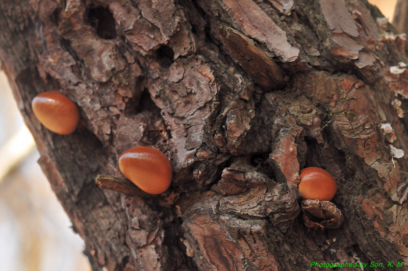 확대해서 본 모습. 크기가 워낙 작은 터라 현미경 등으로 유심히 봐야 한다. 왜냐 하면 지름이 0.02~0.04cm 밖에 안될 정도로 매우 작기 때문이다(...) 자세히 보면, 여러 개가 모여 군집 형태로 이루어진 것이 이 버섯의 특징이다. 모양은 알처럼 동그랗고, 표면은 보리수의 열매처럼 붉은색을 띠고 있으며, 버섯의 질감은 거칠다. 목재부후균에 속하는 종이어서 목재를 분해하는 역할을 한다. 주로 한국, 일본, 유럽 등에 분포한다.