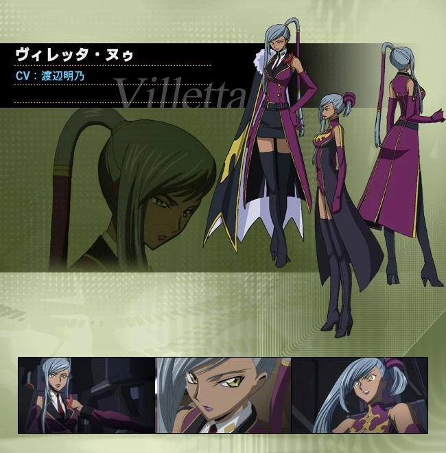| 풀네임:비렛타 누(Villetta Nu) (초기 설정때 이름은 사브리나) CV:와타나베 아케노 (渡辺明乃) 소속:브리타니아군 순혈파→기밀정보국→흑의 기사단→합중국 일본 생년월일:황력 1991년 6월 1일 연령:26세→27세 별자리:쌍둥이자리 혈액형:B형 키 : 172cm |