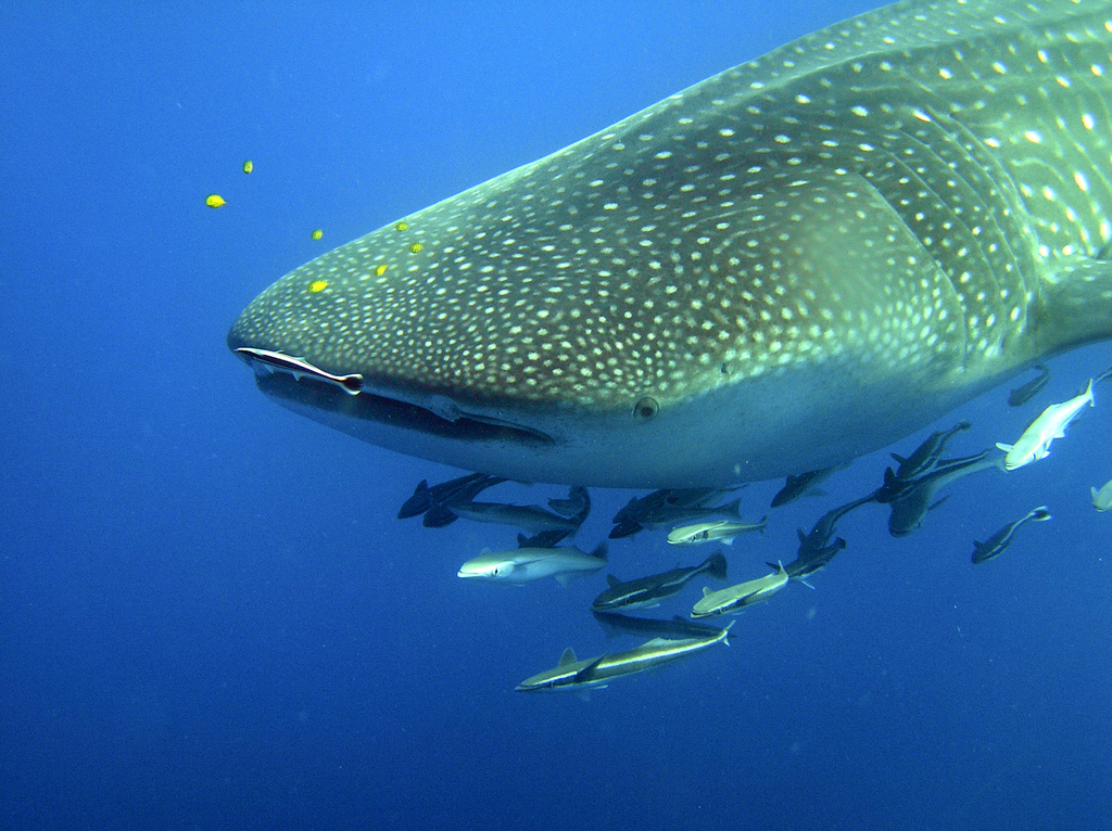 입에 달라붙은 빨판상어를 귀찮게 여기지 않는 고래상어가 대인배로 보인다.(...)[4]