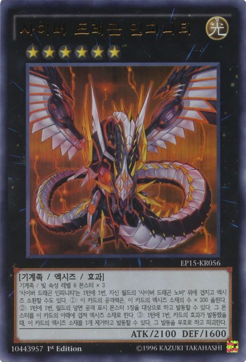 | 기계족 / 빛 속성 레벨 6 몬스터 × 3 "사이버 드래곤 인피니티"는 1턴에 1번, 자신 필드의 "사이버 드래곤 노바" 위에 겹치고 엑시즈 소환할 수도 있다. ①: 이 카드의 공격력은, 이 카드의 엑시즈 소재의 수 × 200 올린다. ②: 1턴에 1번, 필드의 앞면 공격 표시 몬스터 1장을 대상으로 하고 발동할 수 있다. 그 몬스터를 이 카드의 아래에 겹쳐 엑시즈 소재로 한다. ③: 1턴에 1번, 카드의 효과가 발동했을 때, 이 카드의 엑시즈 소재를 1개 제거하고 발동할 수 있다. 그 발동을 무효로 하고 파괴한다. | ||||