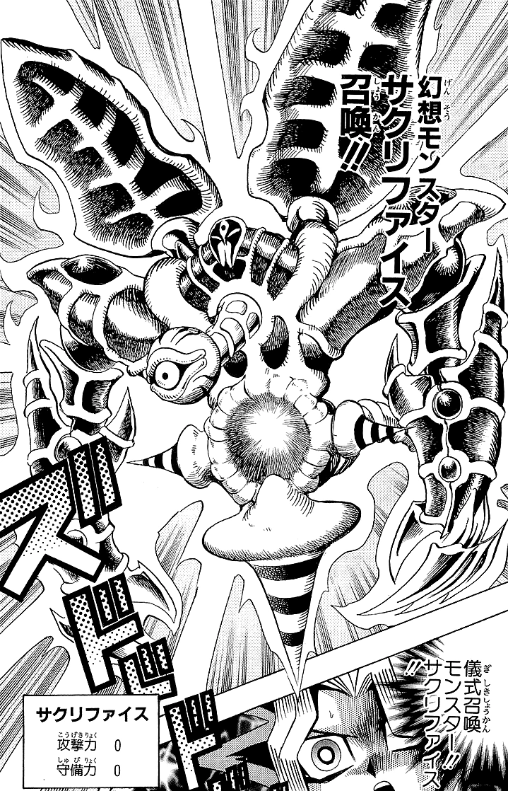 몬스터를 흡수한 새크리파이스를 전투로 때려봤자 장착 몬스터가 대신 파괴되며 자신도 대미지를 먹는다는 점도 성가신 점. 이 대미지는 초창기에는 전투 대미지로 판정되었는데, 이후 룰이 재정비되면서 체인 블록을 만들지 않는 효과 대미지로 주는 것으로 변화되었다.