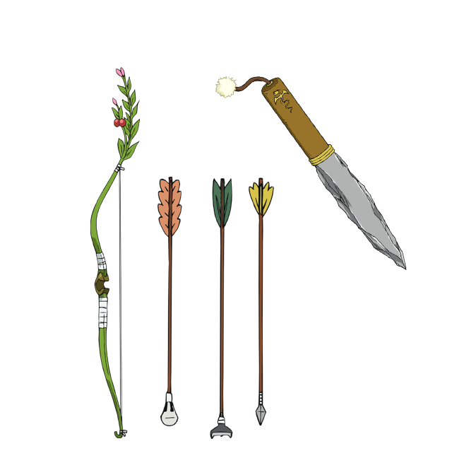 무기로는 활과 돌칼을 사용한다. 활은 잎사귀와 나무열매가 그대로 붙어있는 생나무고 돌칼은 뗀석기다. 단 화살촉은 정교한 금속제인듯하다. 그런 가내수공업으로 만든 것같은 활로 궁술 문장포를 구사하는등 자체 무력은 상당히 높은 편.
