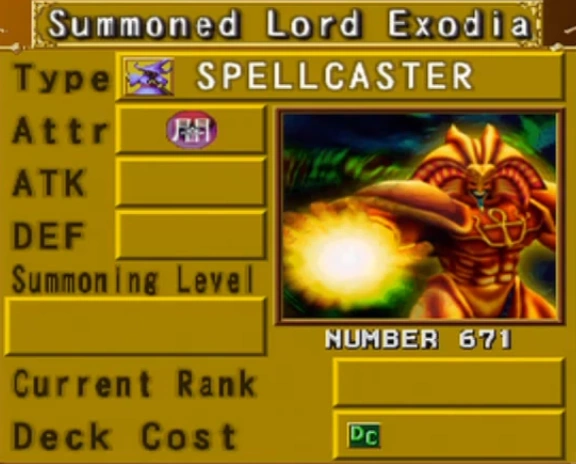 여담으로, 이 "소환신 엑조디아"라는 카드는 실제 수록되기 한참 전인, 고리짝 시절 게임에 수록된 적이 있다. (OCG와는 룰 자체가 다르다) 수록만 되어 있을 뿐, 입수하는 것조차 불가능한 더미 데이터. 현재의 이 카드와는 일러스트부터 다르지만, 실제 카드를 만들 때 참고 정도는 했을 것으로 보인다. 영문판에서는 위와 같이 "Summoned Lord Exodia"라는 번역명이 존재했으나, 실제 수록시엔 전혀 다른 이름으로 바뀌어 버렸다.