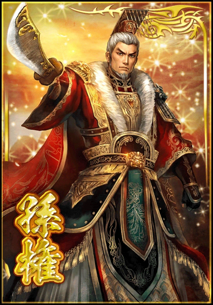 다만 형인 손책보다 삭아보이는 얼굴 등등 때문에 정이 안 간다고도 한다. 삼국지를 모르거나, 손권이 밖으로 드러나기 이전까지만 읽어보고 이 작품으로 처음 손가 3대를 접한 사람 중에는 손견이 아빠[3], 손권이 삼촌[4], 손책이 아들인 줄 아는 사람도 있다. 추가 복장에 정말 황제틱한 복장이 있는 게 특징. 외모에 대한 전반적인 평가는 그냥 원숭이 내지 유인원. 더군다나 일본판 성우도 4편까지 손권의 외모와 목소리 갭이 너무 심하다는 지적이 있었다.