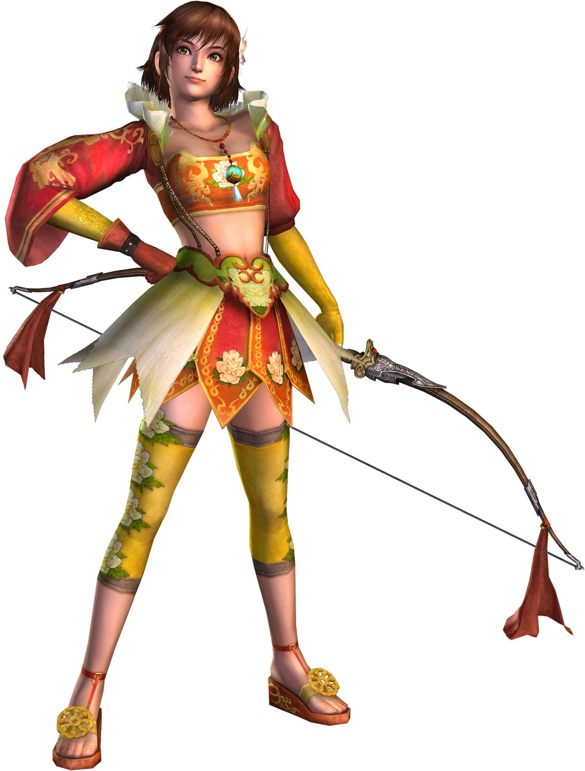 무쌍 오로치에선 이나히메에게 활 쓰는 법을 배웠는지(?) 아츠기 2로 나가는 활 기술이 황충이나 하후연보다 좋아서 궁요희(弓腰姫)라는 이름값을 한다. 물론 이것보다 좋은 아츠기는 아츠기1이다. 아츠기1은 전방에 주황색 차크람을 회전 시키는 공격인데 대미지가 강하고 존내 좋다. 그리고 같은 활공격인 황충, 하후연보다 성능이 좋다.[19] 그러나 마왕재림에서는 반대로 되어 손상향은 무경직, 대미지 약화 너프세트를 먹고 황충, 하후연이 강해졌다. 그리고 차지6도 막타에 속성부여인데 판정이 병신같아서 쓸만하지 않고 이나히메와 같이 하위권에 맴도는 캐릭터가 되었다. 말 그대로 친구따라 강남간다.