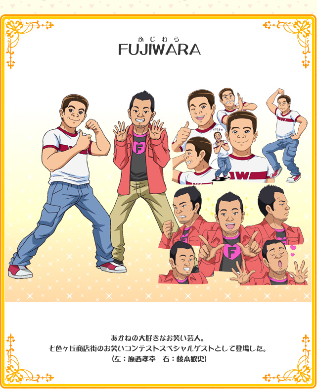 - 17화에 등장한 실제로 존재하는 개그 콤비 'FUJIWARA'. 성우 역시 후지모토 토시후미 & 하라니시 타카유키 본인들이 담당. 한국판 성우는 이현 & 김혜성. 아카네가 좋아하는 개그 콤비이기도 하다. 작중에서는 '배드엔드 왕국'의 간부인 마조리나도 알 정도로 매우 유명한 개그 콤비로 소개되었으나, 이 분야에 관심이 없는지 아오키 레이카만은 전혀 모르고 있었다.(...) 배드엔드 공간에서 자력으로 깨어난 뒤 마조리나의 마법아이템을 깨부수고 프리큐어 변신을 시도, "내츄럴 파워는 야생의 힘, 큐어 고릴라!!!"로 변신을 성공!...할리가 있나. 전투가 끝난 뒤,프리큐어에 관한 일은 비밀로 하겠다고 아카네에게 약속했으나,프리큐어 변신은 이 콤비의 소재거리가 되고 말았다.