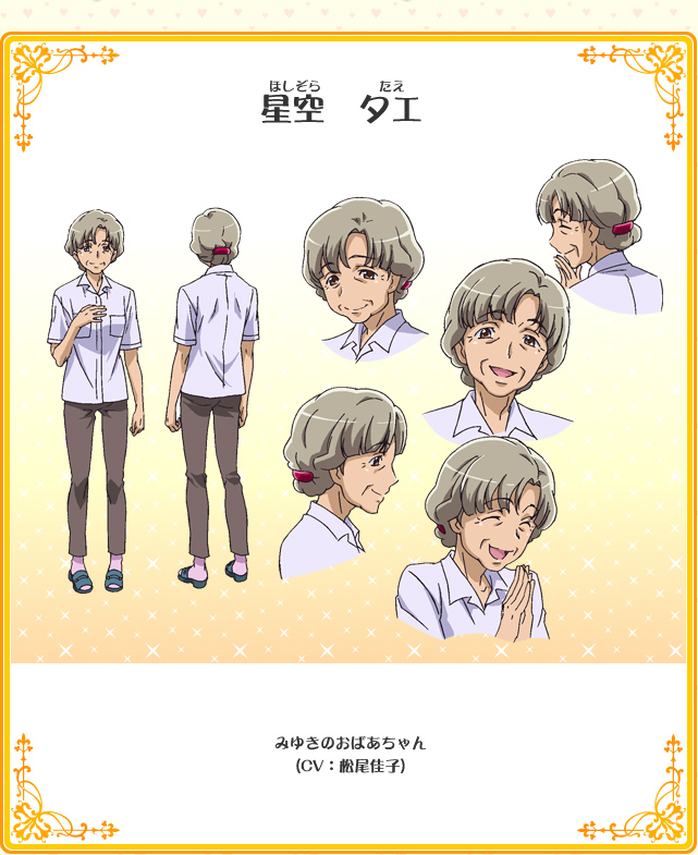 - 성우는 마츠오 요시코 / 임은정[13]. 미유키의 할머니. 시골에서 혼자 밭을 일구며 살고 계신다. 미유키가 동화를 좋아하는 것은 어렸을 때 할머니에게 텐구나 캇파 등, 옛날 이야기를 자주 들었기 때문. 역대 프리큐어의 할머니가 대부분 그랬듯이 이분도 범상치 않은 포스를 풍긴다. 캔디가 인형이 아니라는 걸 알아차리고, 울프룬을 만나도 전혀 무서워하지 않고,[14] 심지어는 배드 엔드 공간이 펼쳐졌는데도 전혀 절망하지 않았다! 울프룬은 황당해하며 왜 절망하지 않는거냐고 기겁을 했고, 할머니는 '가끔 절망할 때도 있는 법. 태양은 언젠가 반드시 떠오른다' 라고 하시면서 정신력 만렙을 찍은 모습을 보여주셨다. 덕분에 간부가 와서 배드 엔드 공간을 펼쳤는데도 배드 에너지를 수집하지 못한 최초의 에피소드가 되었다. 추가적으로, 분명하게 묘사되지는 않았으나 산이나 강에 사는 초현실적인 존재들과 친분이 두터운 데다 의사소통까지 가능하신 것 같다. 여러모로 비범한 면모를 보이시는 분. 44화에서도 미유키의 과거 회상으로 오랜만에 등장했다. 친구가 없던 미유키에게 미소가 제일이라면서 손거울을 선물해줬다. 최종화에서는 미유키네 집에서 함께 살게 되신 듯 하다.