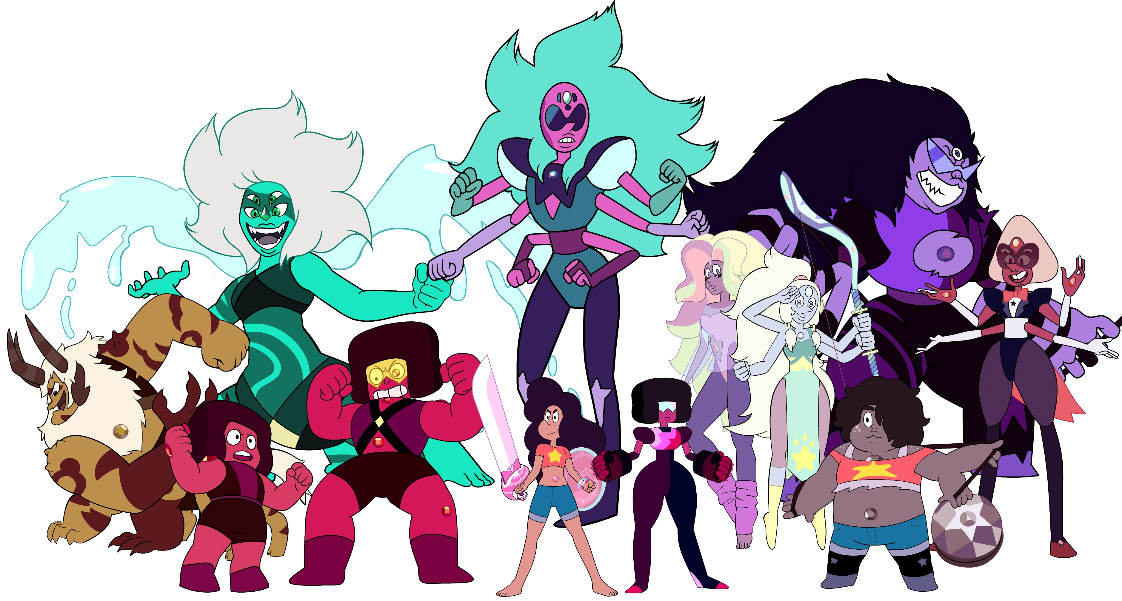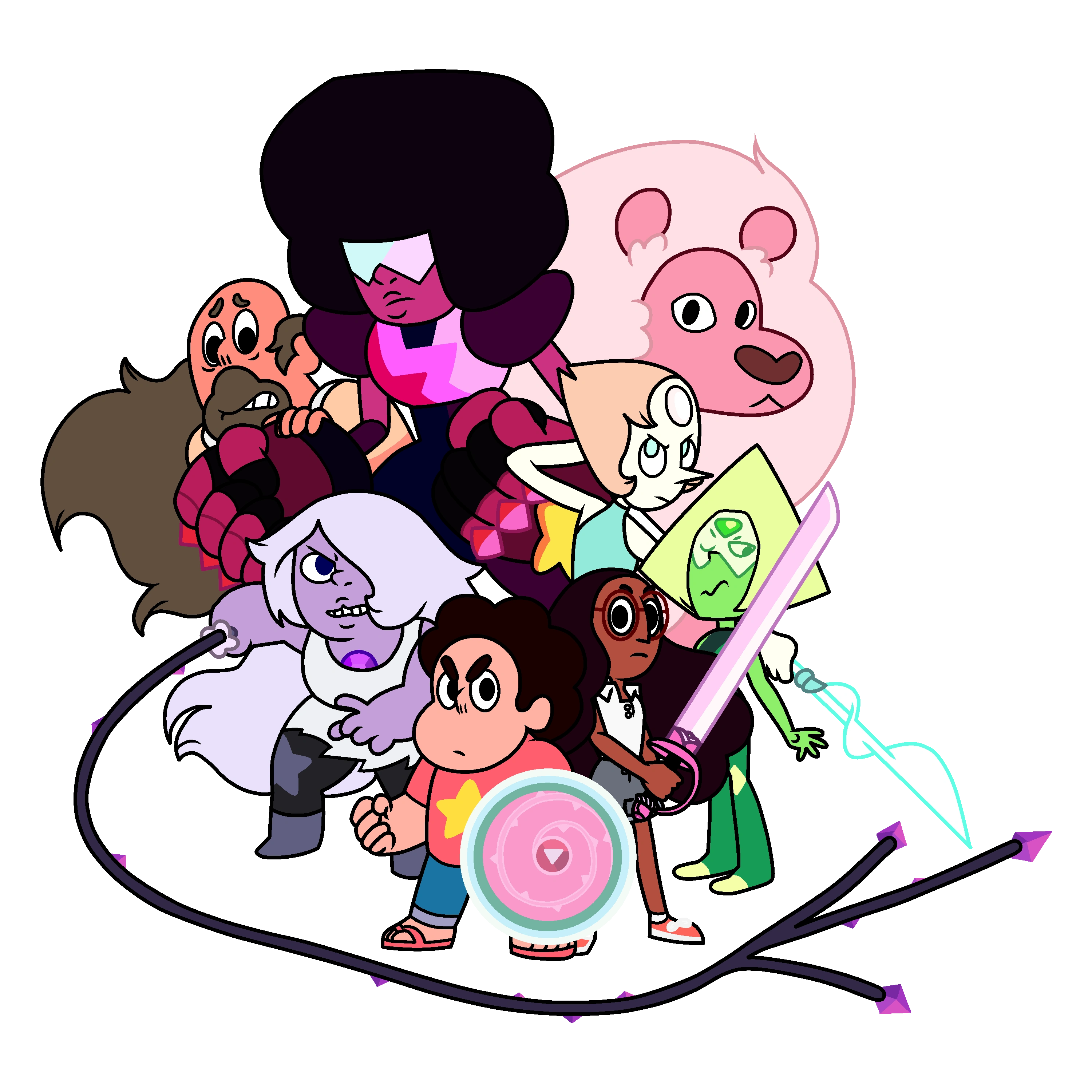 | 크리스탈 젬스 | 스티븐, 펄, 에머티스트, 가넷(루비, 사파이어), 페리도트(시즌 2 25화 이후), 로즈 쿼츠, 비스무트, 크레이지 레이스, 빅스, 스노우플레이크 |