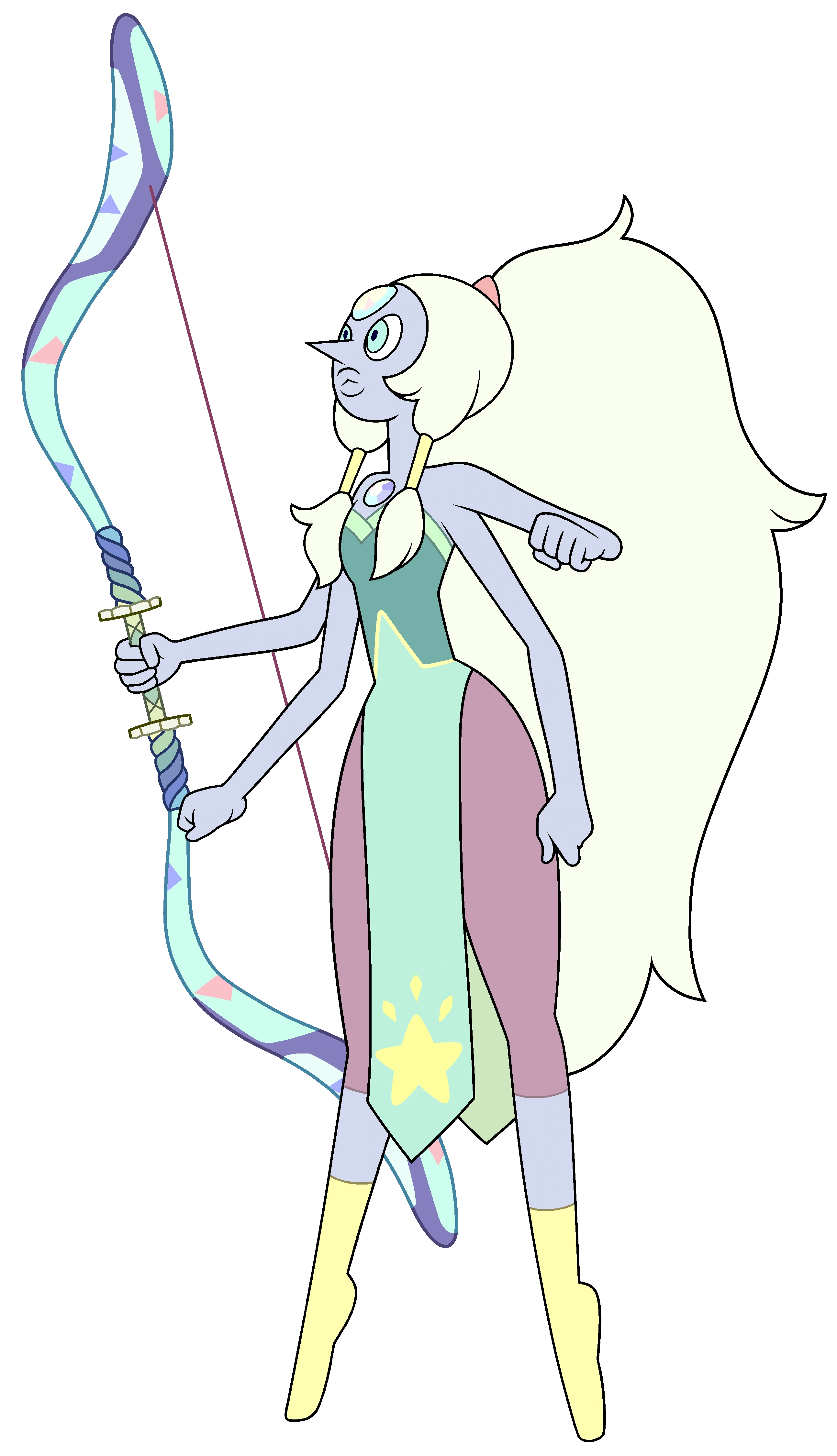 - ↑ 펄의 창에 가넷의 건틀릿을 합친 망치를 사용하는 사도닉스, 애머티스트의 채찍에 가넷의 건틀릿을 단 철퇴를 사용하는 서길라이트, 그리고 애머티스트의 채찍과 펄의 창을 합쳐 활로 사용하는 오팔과 같다
