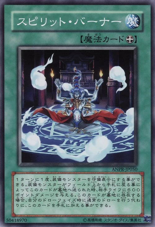 사실 이 카드, 스피릿 몬스터들을 의식해서 만들어졌을 가능성이 높다. 일러스트에 있는 것도 아수라고, 스피릿 몬스터에 이 카드를 장착해두면 600의 번 대미지를 입히는 효과가 발동되는 - 이 카드 이름 그대로 스피릿 버너가 된다. 하지만 스피릿 덱에서는 가장 중요한 수비표시 변경 효과를 쓸 일이 없는지라 결국 이 카드는 자기 이름대로 쓰이지 않는다.