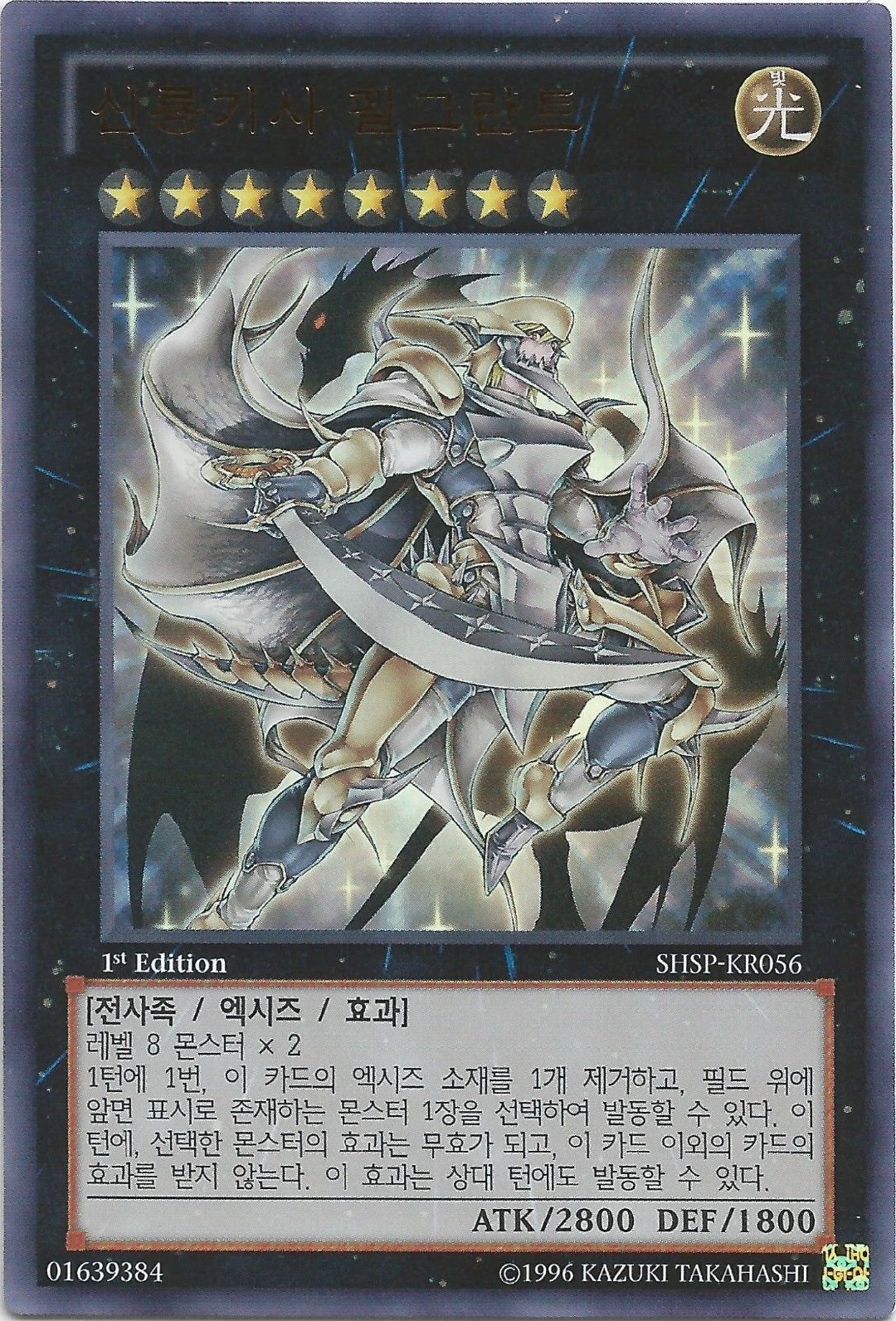 | 레벨 8 몬스터 × 2 ① : 1턴에 1번, 이 카드의 엑시즈 소재를 1개 제거하고, 필드 위에 앞면 표시로 존재하는 몬스터 1장을 대상으로 하고 발동할 수 있다. 이 턴, 대상 몬스터의 효과는 무효화되고, 이 카드 이외의 효과를 받지 않는다. 이 효과는 상대 턴에도 발동할 수 있다. | ||||