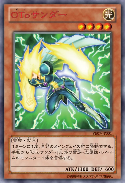 | 1턴에 1번, 자신의 메인 페이즈에 발동할 수 있다. 자신의 패에서 OTo썬더 이외의 번개족 빛 속성 레벨4이하의 몬스터를 일반 소환한다. | ||||