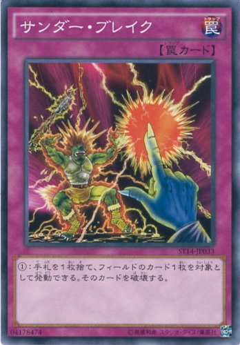 카드 이름이 그레이트 마징가의 필살기 이름과 같은데, 손가락으로 벼락을 날리는 일러스트를 보면 거기서 가져온 이름이 맞는 듯. 그래서 위대한 마수 가제트를 코스트로 버리거나 필드에 깔아놓고 썬더 브레이크를 쓰면 뭔가 그럴듯해 보인다. 영어판 이름은 어째서인지 원래 영어였던 걸 굳이 다시 일본어로 '뇌격(雷擊) 브레이크'로 바꿔놓은 찌릿한 이름이 되었다. 초기 북미권의 카드 번역이 일본어의 음독을 그대로 영어로 옮기는 경우가 많았는데 그 중 하나다.