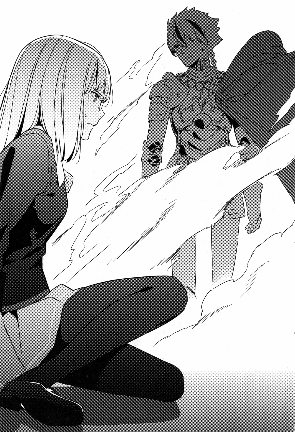 하지만 반파된 오페라 하우스 때문에 경찰에 붙잡히고, 세이버가 나서서 대신 혐의를 뒤집어써서 일단 둘 다 경찰서로 연행된다. 아야카는 성배전쟁에 말려들기 싫어서 세이버를 거부하고 있으나, 아야카의 문신 때문인지 마력선이 연결되어 마스터는 아니면서도 서번트를 사역하는 기묘한 사태. 일단 세이버는 아야카의 희망은 어찌됐든 아야카를 돌보고 있다.