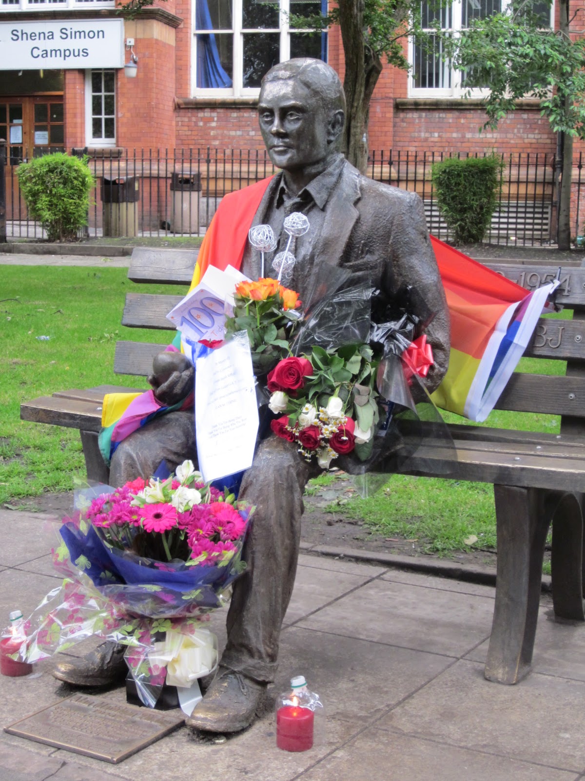 튜링 메모리얼의 모습. 프라이드 플래그로 장식되어 있다.